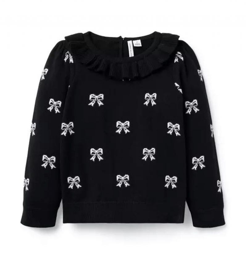 Bows upon bows for our soft sweater. A ruffle collar adds the perfect finishing touch.