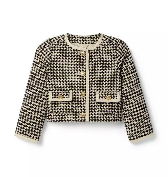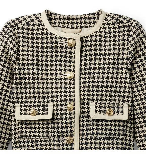 Trending tweed and classic houndstooth dress up any look. Our chic cropped jacket feaures grosgrain ribbon trim and gold-tone buttons, plus pockets for the little things.