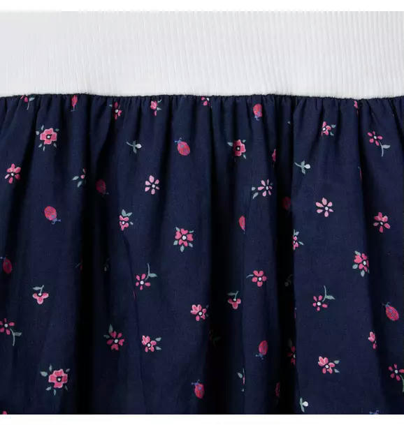 The perfect pick to dress up or down. Featuring a ribbed top and a trendsetting bubble hem with allover ditsy florals.