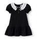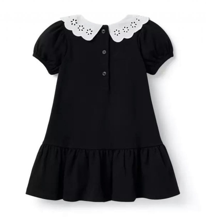 A classic with all our favorite finishes. This ponte dress features puff sleeves, an eyelet lace collar and a bow at the neck. A stylish dropwaist silhouette keeps things extra chic.