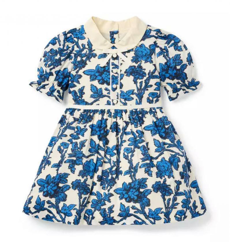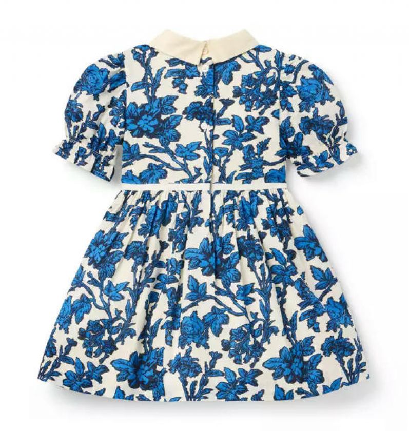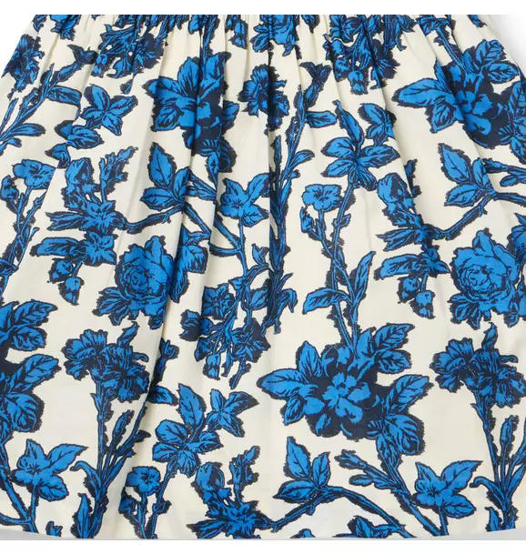 A garden of details for this floral favorite in pure cotton. It's finished with contrast piping, a bow at the collar and puff sleeves, plus ruffle cuffs and pearl-tone buttons.