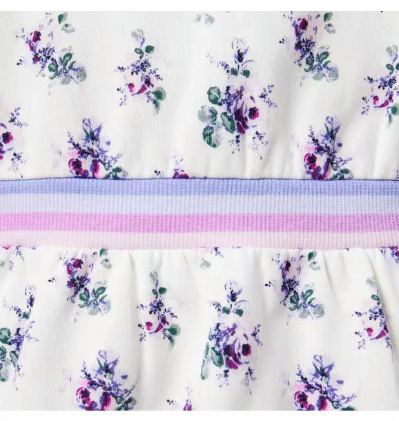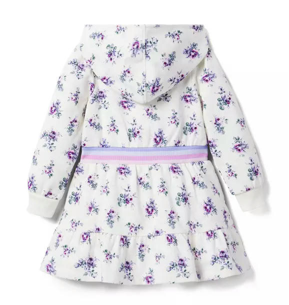 An extra cozy dress in soft fleece. Detailed with allover florals, plus a ruffled hem and ribbed striped waistband. In a hooded style perfect for wherever the day takes them.