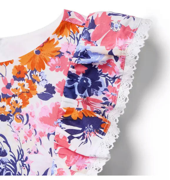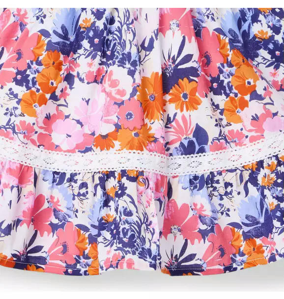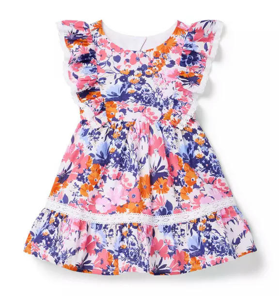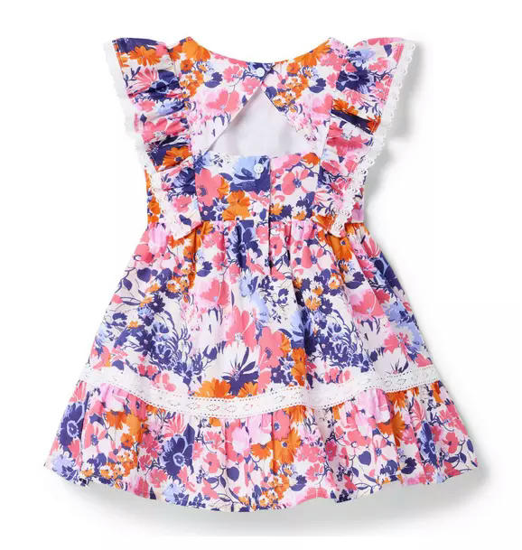 A floral favorite trimmed in lace for extra frills. Featuring flutter sleeves, a ruffle hem and a cutout detail at the back.