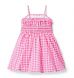 Our dress in gingham seersucker checks every style box. With a ruffle at the neck and a smocked waist too.