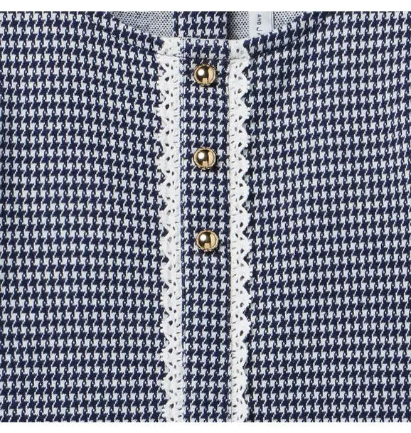 Timeless houndstooth, tailored to perfection. Our soft jacquard dress features a dropwaist silhouette and tiered ruffles, plus lace trim and gold-tone button details.
