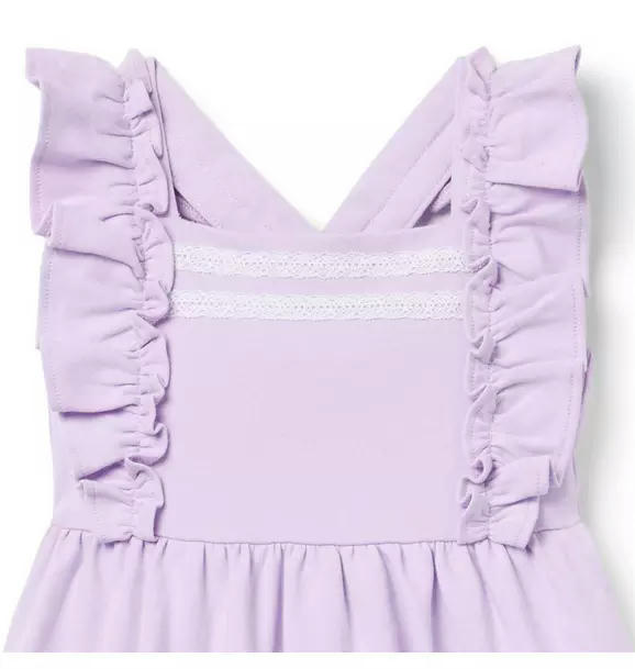 Our dress in soft ponte is ready to style up or down, just say when. Featuring ruffle cross back straps and lace trim details too.