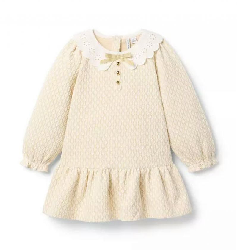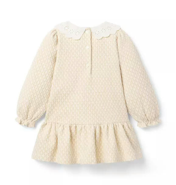 Sparkling knit jacquard shines bright for any occasion. In a dropwaist silhouette with an eyelet collar, bow at the neck and button details too.