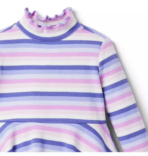 The dress to add to their lineup. This soft ribbed favorite is an instant love with allover stripes, a ruffled neck and ruffled cuffs too.