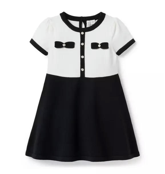 We'll never say no to bows. Our soft sweater dress is detailed with bows, buttons and puff sleeves. Take it for a spin.