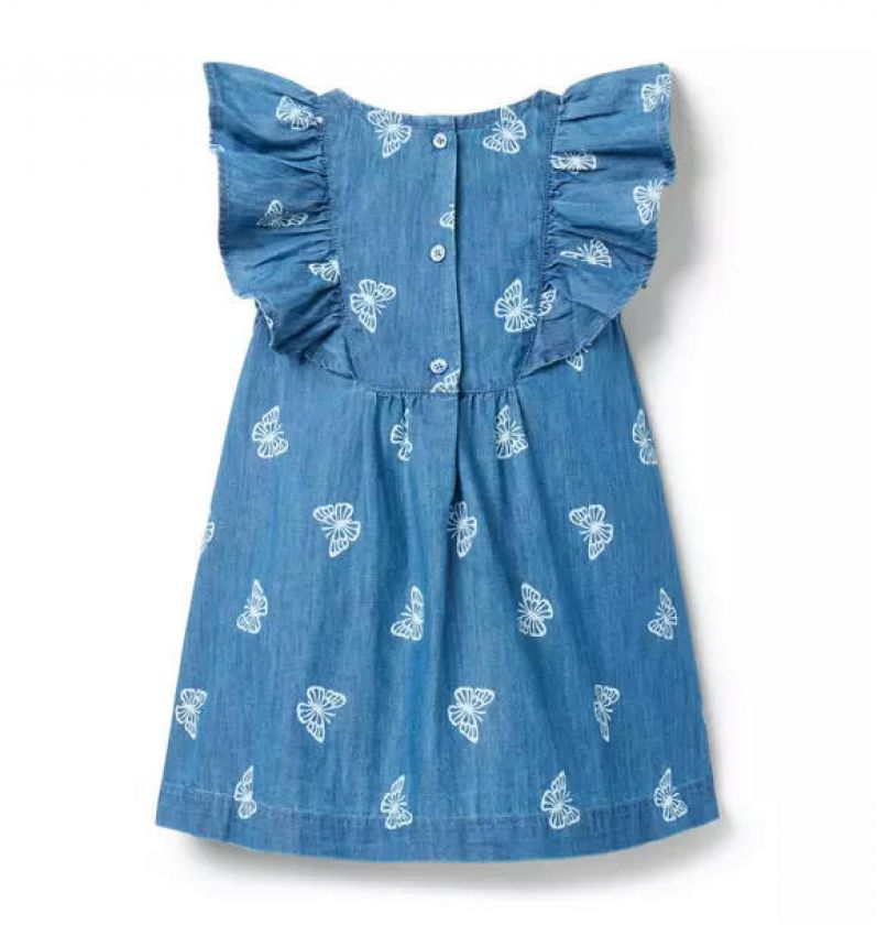 Our classic chambray dress sets hearts aflutter with its butterfly print, flutter sleeves and loop trim. Just add a sunny day.
