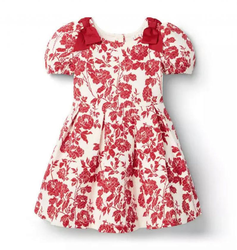 Florals are something to celebrate with our occasion-worthy dress. Featuring allover quilting and bows at the shoulders, plus puff sleeves and a pleated skirt.
