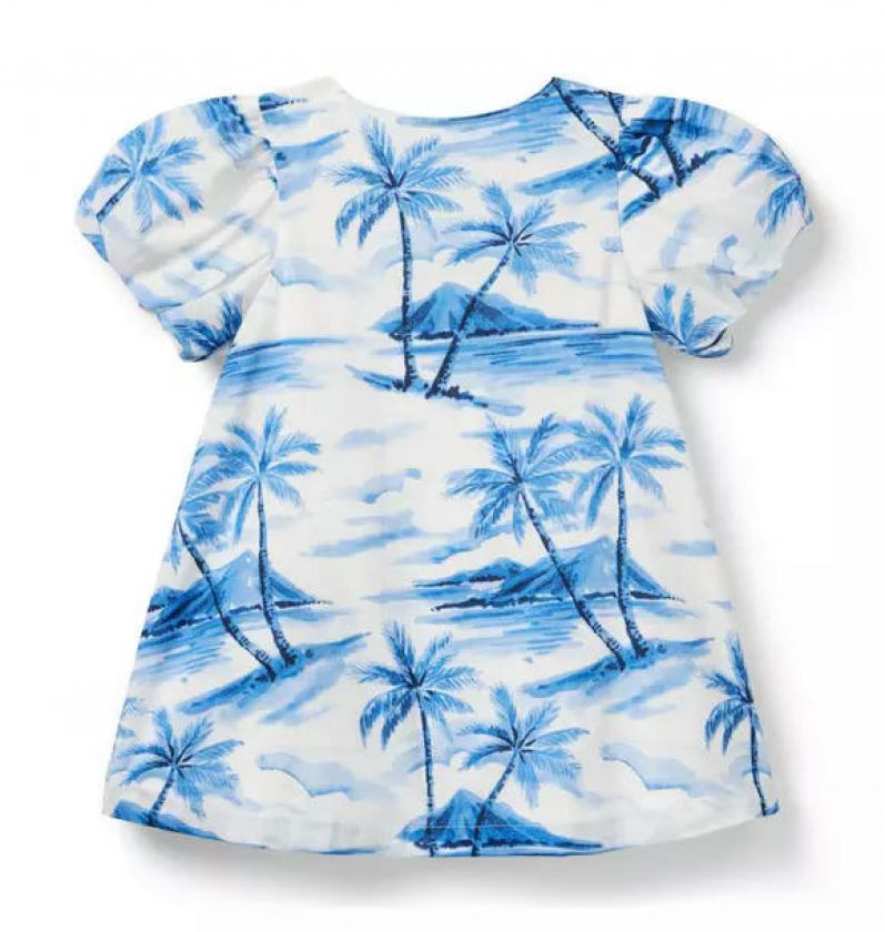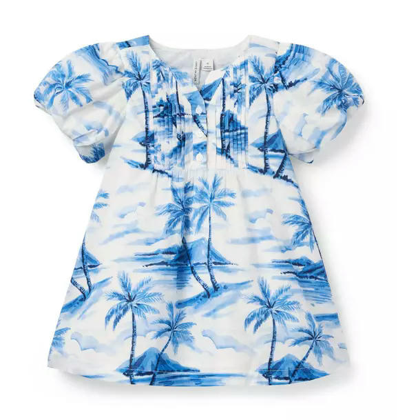 Vacation-ready style for getaways or any day. Our dress in pure cotton features an allover palm tree print, puff sleeves and pintuck details too. Designed in an effortless shift silhouette.