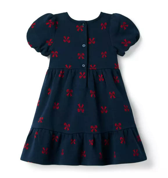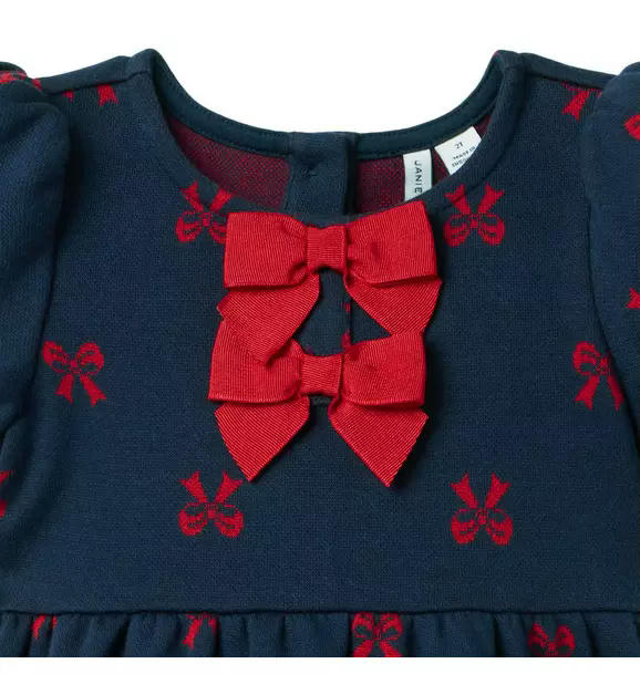 All the festive frills for this dress in soft knit jacquard. With an allover bow print and grosgrain bow details, plus puff sleeves and a ruffle skirt.