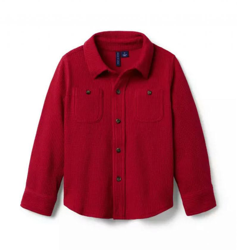 A cozy take on our tailored shirt in a soft, textured waffle knit. Finished with double chest pockets and horn buttons.