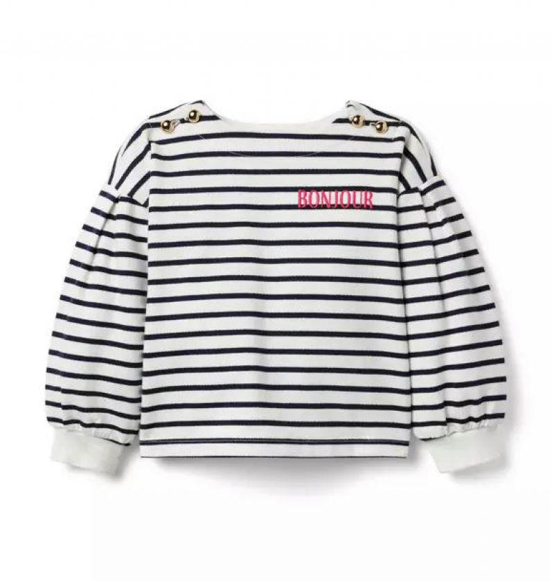 For classic French girl style, reach for our striped sweatshirt in pure cotton French terry. With puff sleeves, an embroidered Bonjour detail and gold-tone buttons.