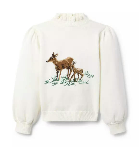 A sweater stitched with deer friends. Soft and cozy with ribbed details and a scallop- trimmed turtleneck.