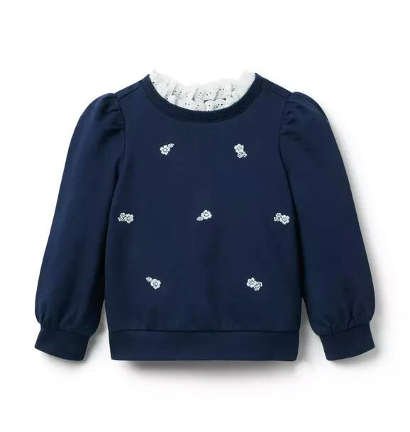 A layer we love, stitched with embroidered flowers. Designed in soft French terry with puff sleeves, a ruffle collar and ribbed details too.