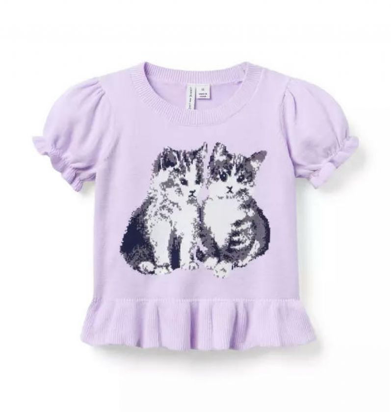 Kittens, puff sleeves and a peplum hem too—all the details we love for this soft sweater top.
