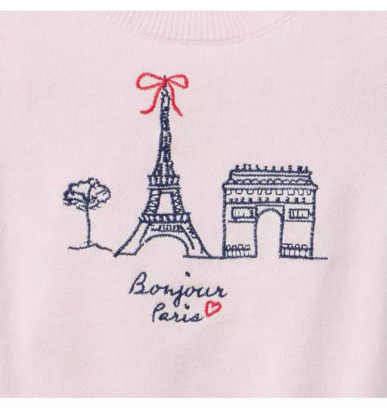 Say bonjour to this wardrobe favorite inspired by the City of Light. In soft cotton with an intarsia Paris design, ruffle sleeves and ribbed details too.