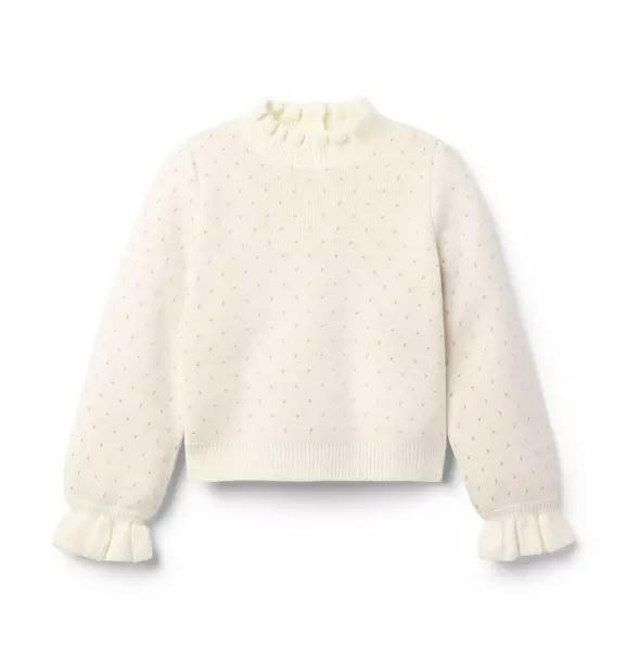 Style is spot on in our dot sweater. With hints of sparkle, ribbed details and ruffles at the collar and cuffs.