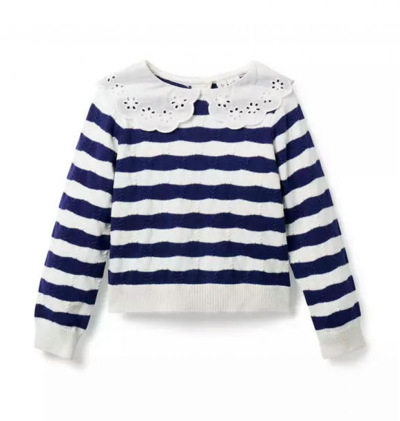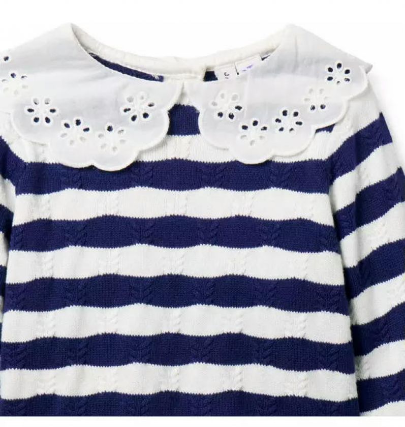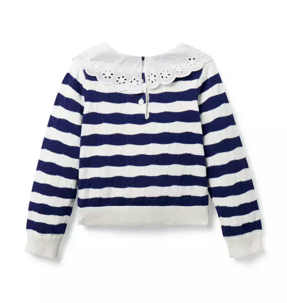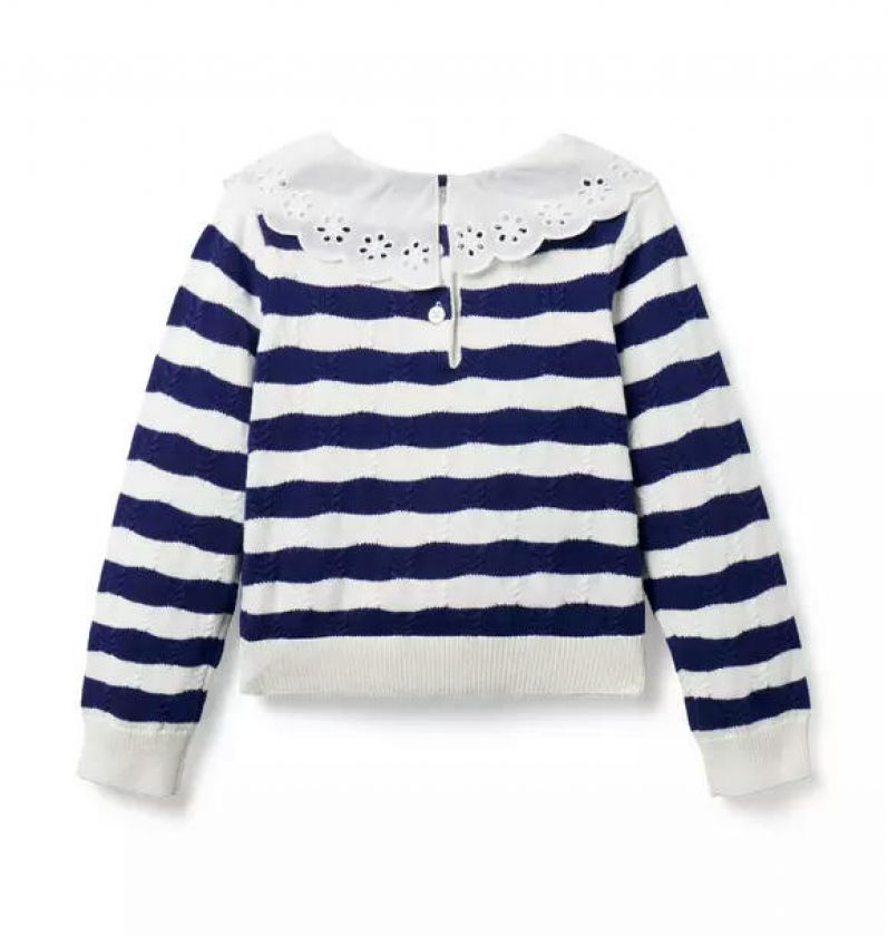 Stripes are always in our lineup, and this cozy sweater is no exception. Designed in a textured knit with a scalloped eyelet collar and ribbed details too.