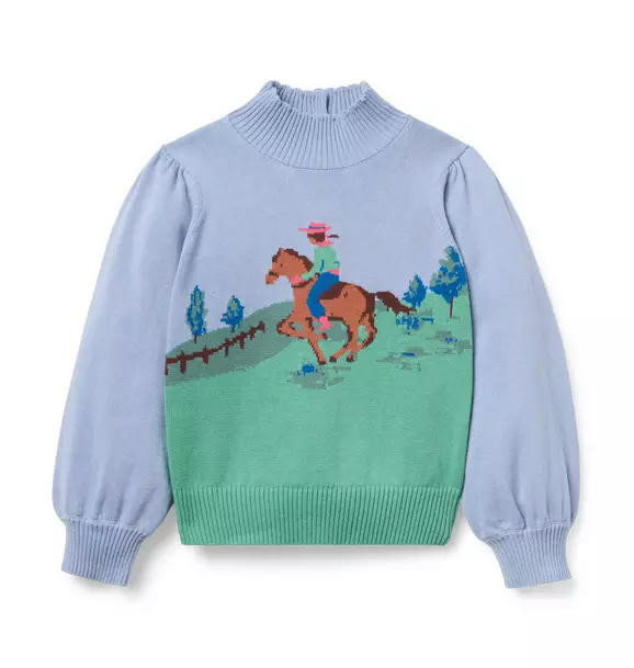Saddle up for sweater weather. With an intarsia cowgirl design, ribbed details and a scallop trimmed turtleneck, our puff sleeve sweater is an instant favorite.