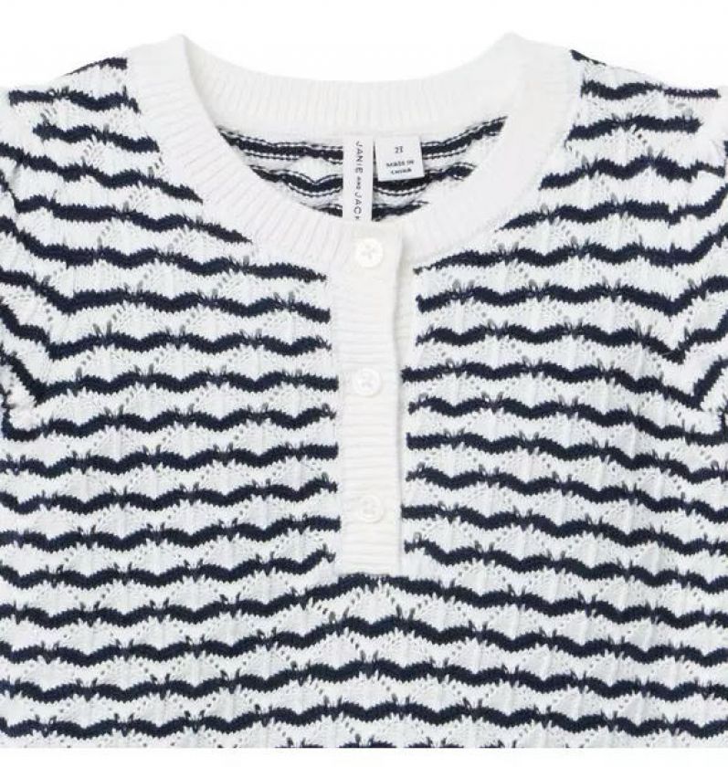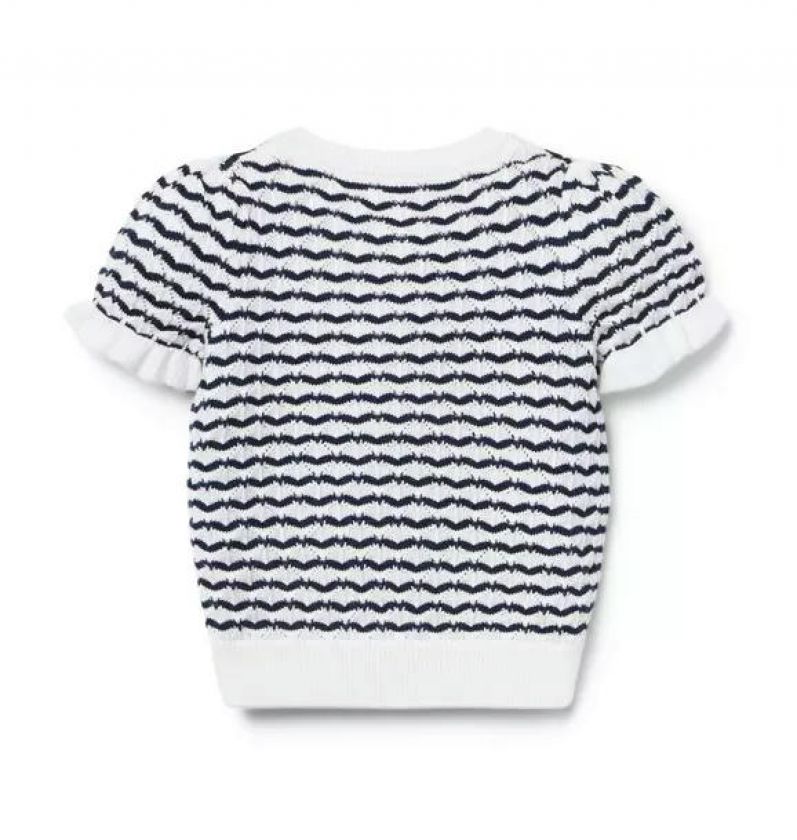 A cozy sweater top that's just our stripe. In allover pointelle with wavy stripe details, puff sleeves and ruffle cuffs.