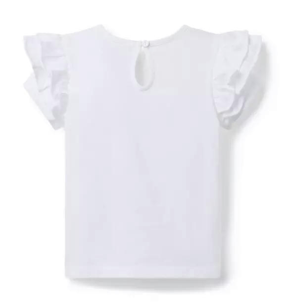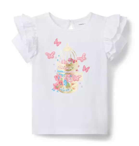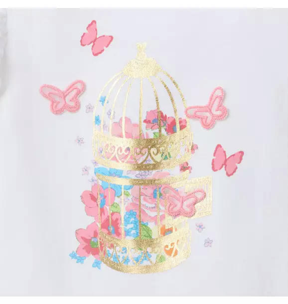 Soar into sunny days in our soft jersey tee. Featuring ruffle sleeves, embroidered butterflies and metallic details.