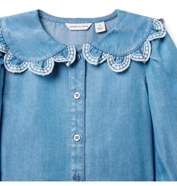 This chambray must-have rises to the top with its scalloped collar, embroidered details and ruffle cuffs. It pairs well with just about everything.