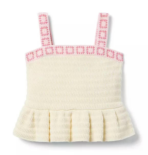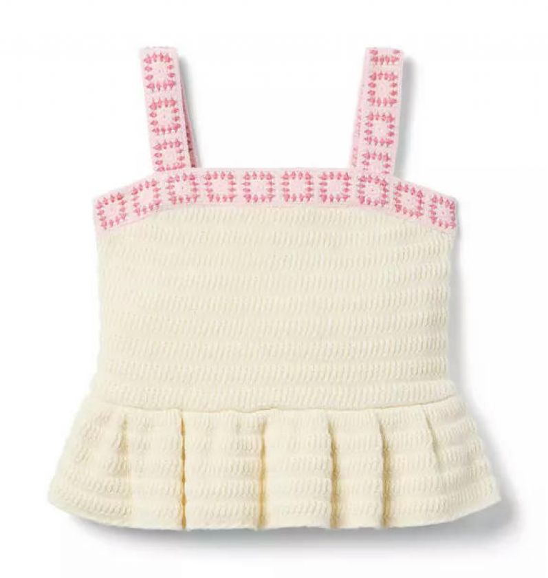 Our soft crochet top pairs perfectly with just about everything. Designed in pure cotton with floral trim and a trending peplum silhouette.