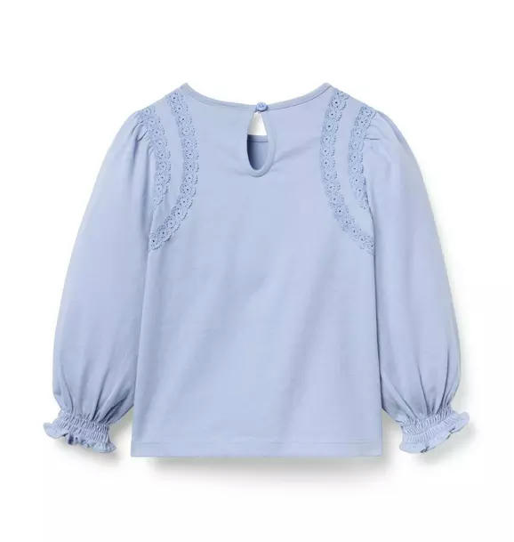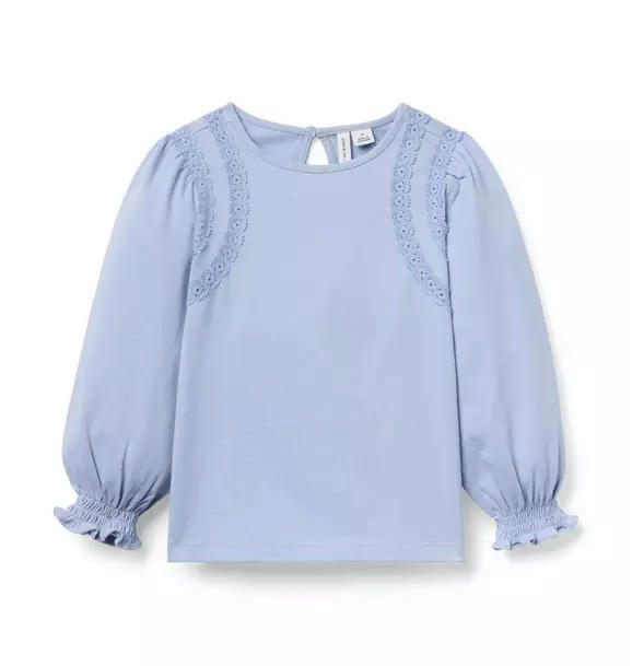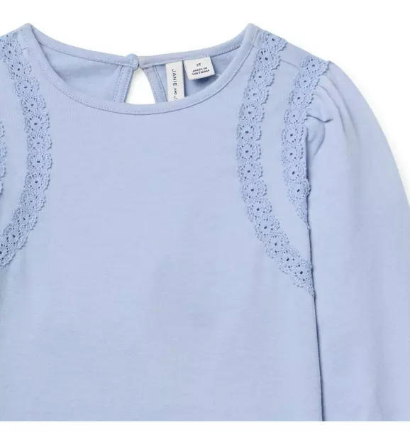 Our soft jersey top gets a stylish twist with crochet lace trim. Plus, ruffle cuffs for extra frills.