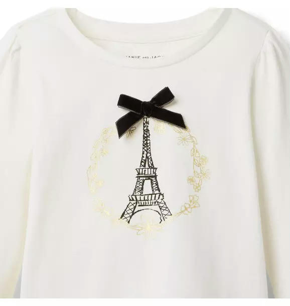 Style inspiration from Paris, all tied up with a bow. Our puff sleeve tee features an Eiffel Tower graphic, metallic details and a velvet bow too.