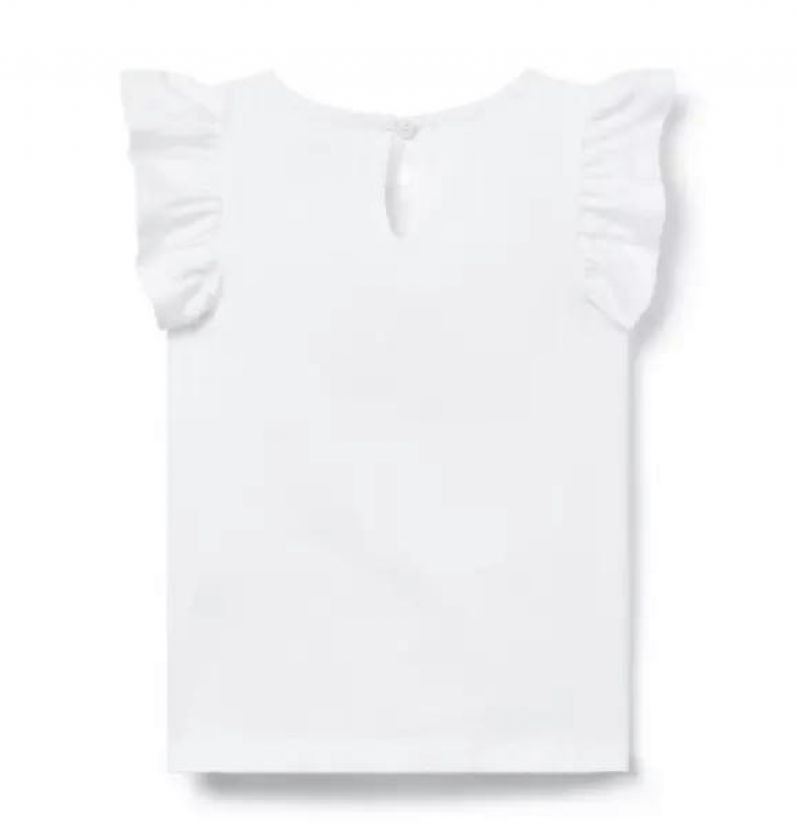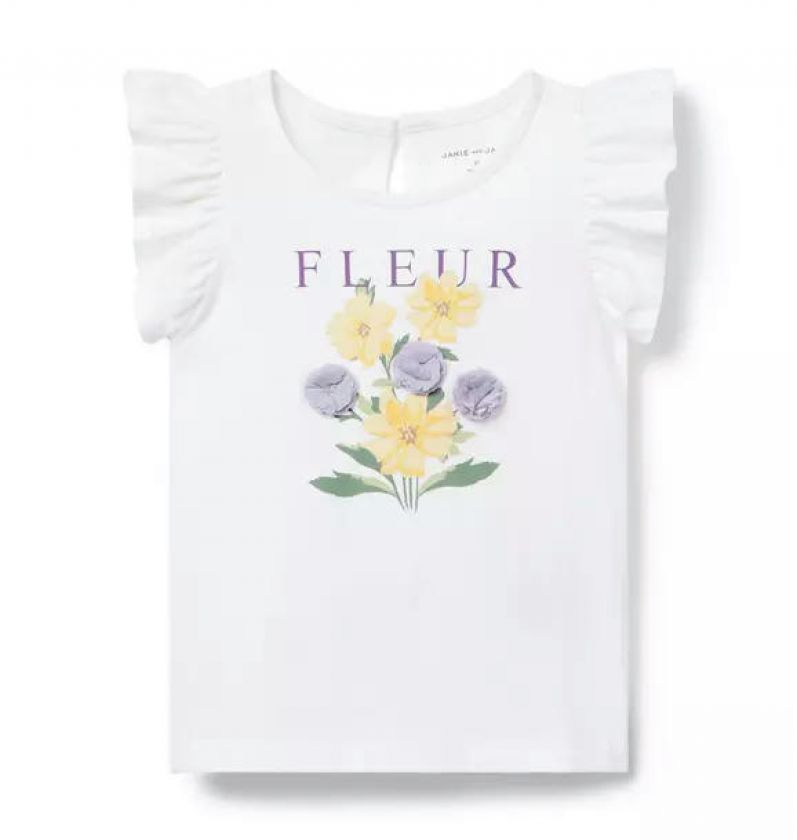 Style blossoms with our tee in soft cotton jersey. With a screenprinted graphic, 3D floral applique details and ruffle sleeves.
