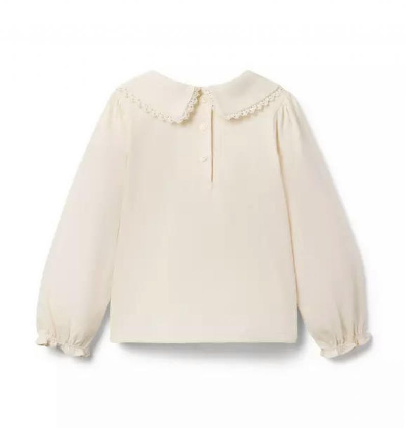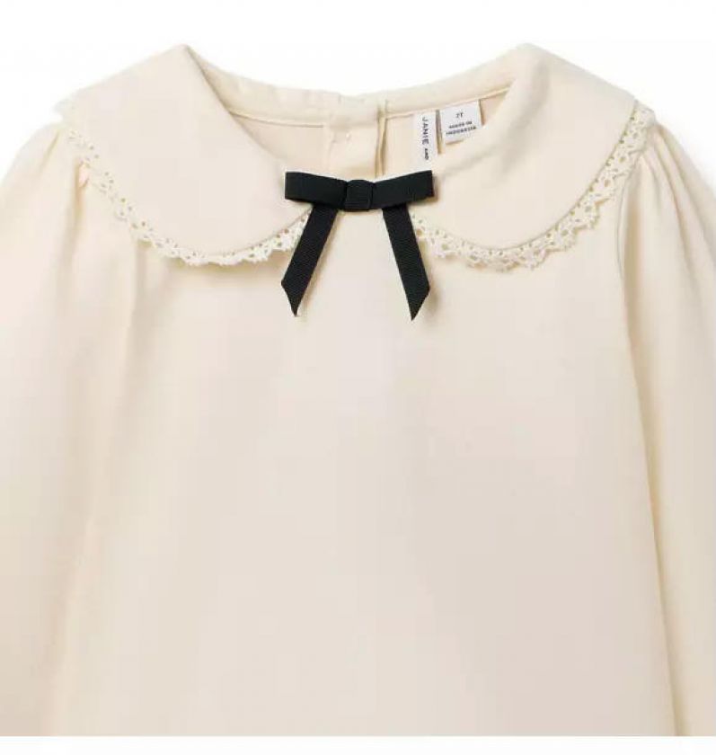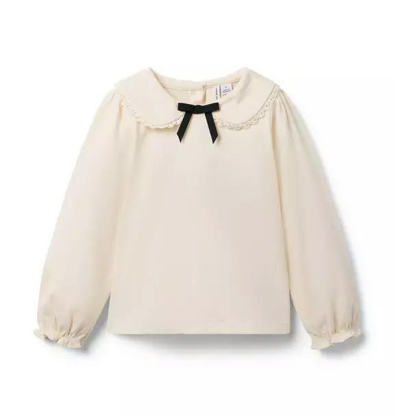 Little details make our soft jersey top extra special—from the lace-trimmed collar to the grosgrain bow detail and the ruffle cuffs.