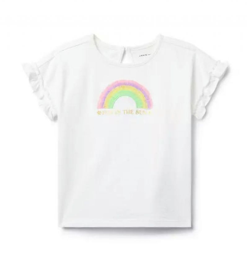 For fun in the sun, reach for our soft jersey tee. Featuring a fringe rainbow graphic, ruffle cuffs and metallic details for a little extra shine.
