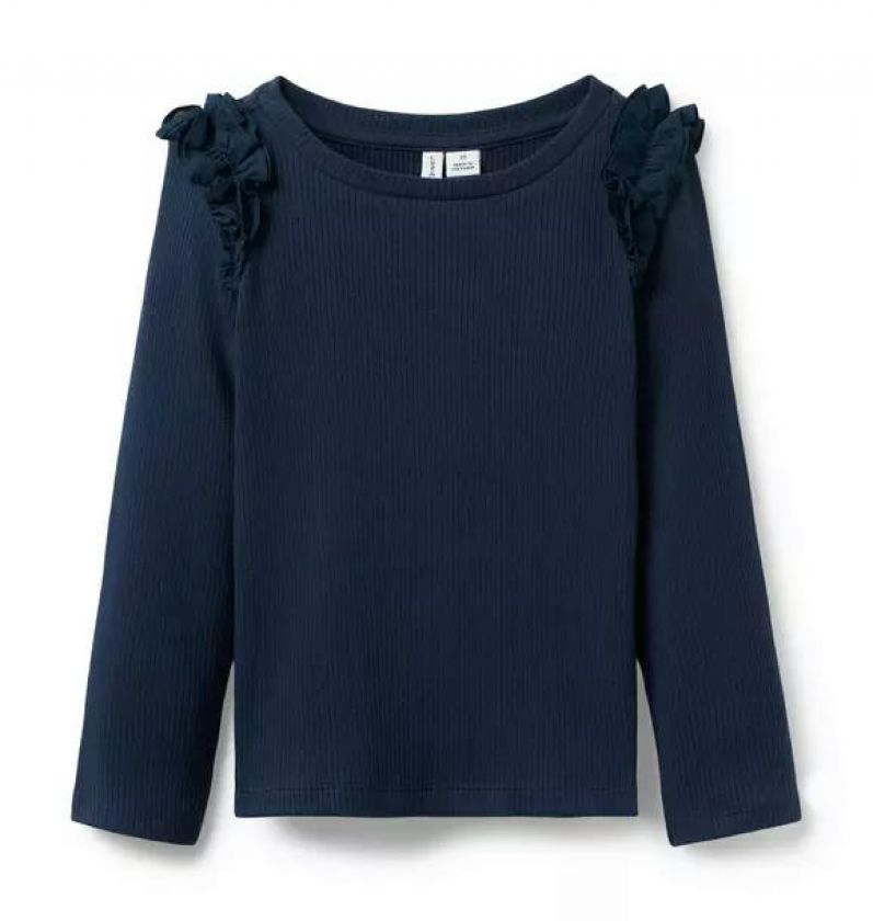 Our ribbed top is extra cozy in soft, brushed fabric. Finished with ruffles at the shoulders, it's ready to pair with all their favorites.