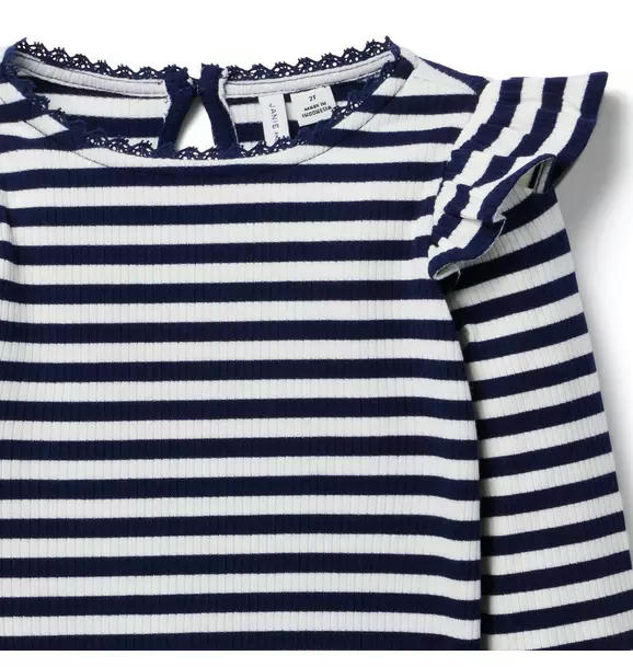 Our classic ribbed top gets an upgrade with ruffled shoulders and scalloped crochet lace at the neckline. It effortlessly pairs with all their favorites.