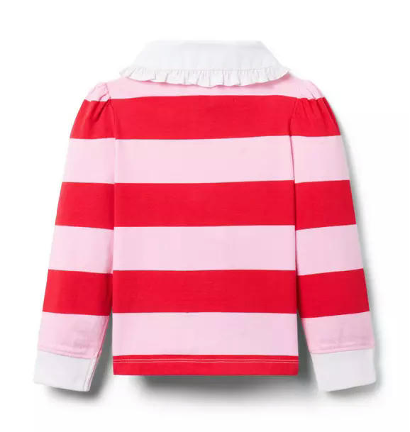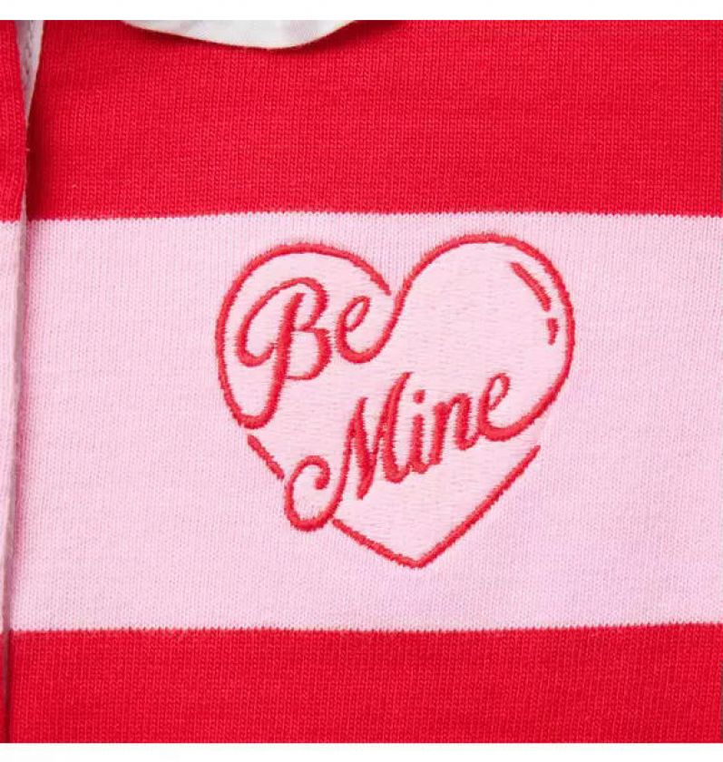 Nothing but love for our Valentine-inspired rugby top. Featuring allover stripes, a ruffle trimmed collar and an embroidered Be Mine detail.