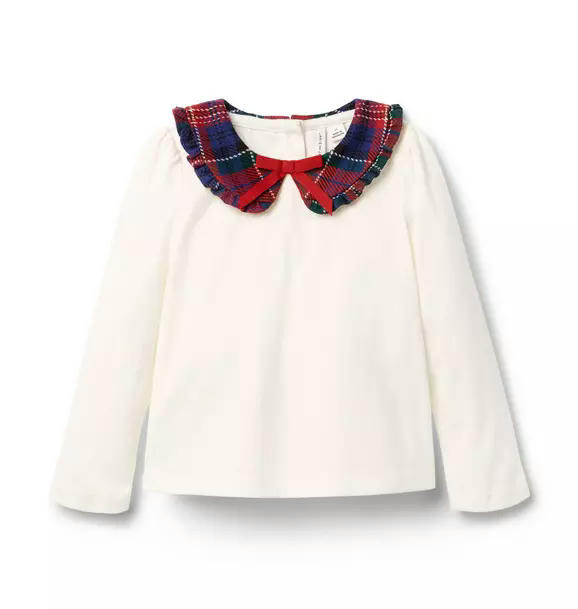 Holiday style starts at the collar with this soft cotton jersey top. Featuring festive tartan, ruffle trim and a bow, of course.
