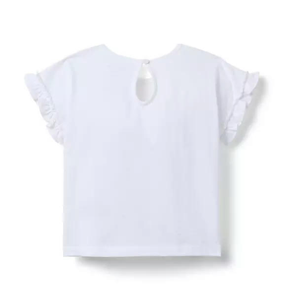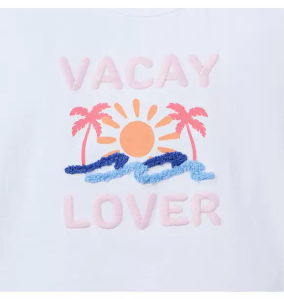 Our soft jersey tee brings the vacation vibes with its ruffle sleeves, embroidered Vacay Lover graphic and boucle details too.