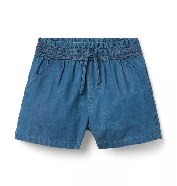 A favorite for sunny day style in pure cotton chambray. Our short features a ruffle detail, smocking and pockets too.