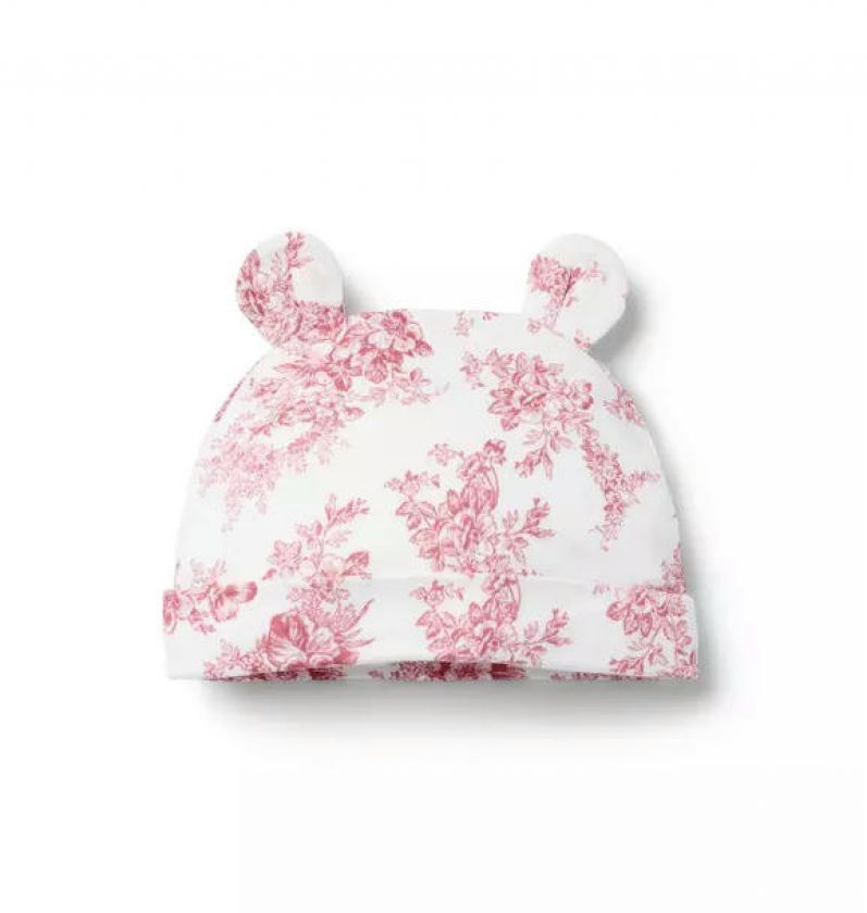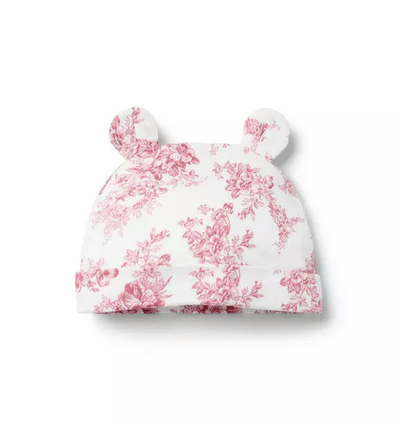 Welcome baby in our soft bear ear beanie. We love its floral toile and foldover detail for extra coziness.