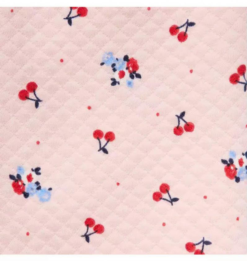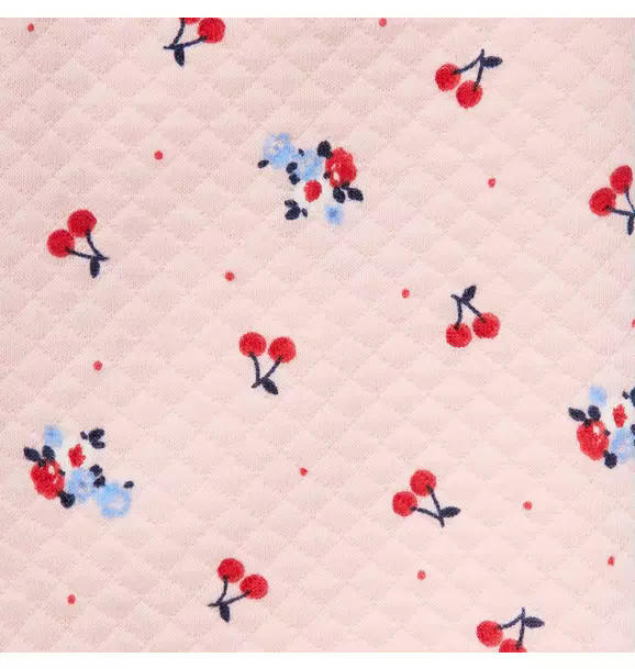 Our quilted cherry floral pant is ready for first adventures or cozy days at home. Designed with ruffle details, a bow and a little back pocket too.
