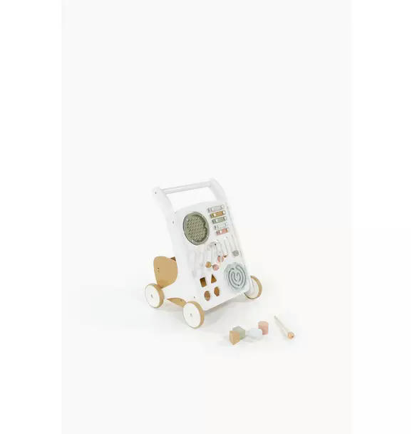 Comes with: spinning mirror and rain maker combo, wood block shapes sorter, adjustable friction wheels for different stage walkers, mallet included for xylophone, metal bead maze for dexterity, and basket for carrying toys.