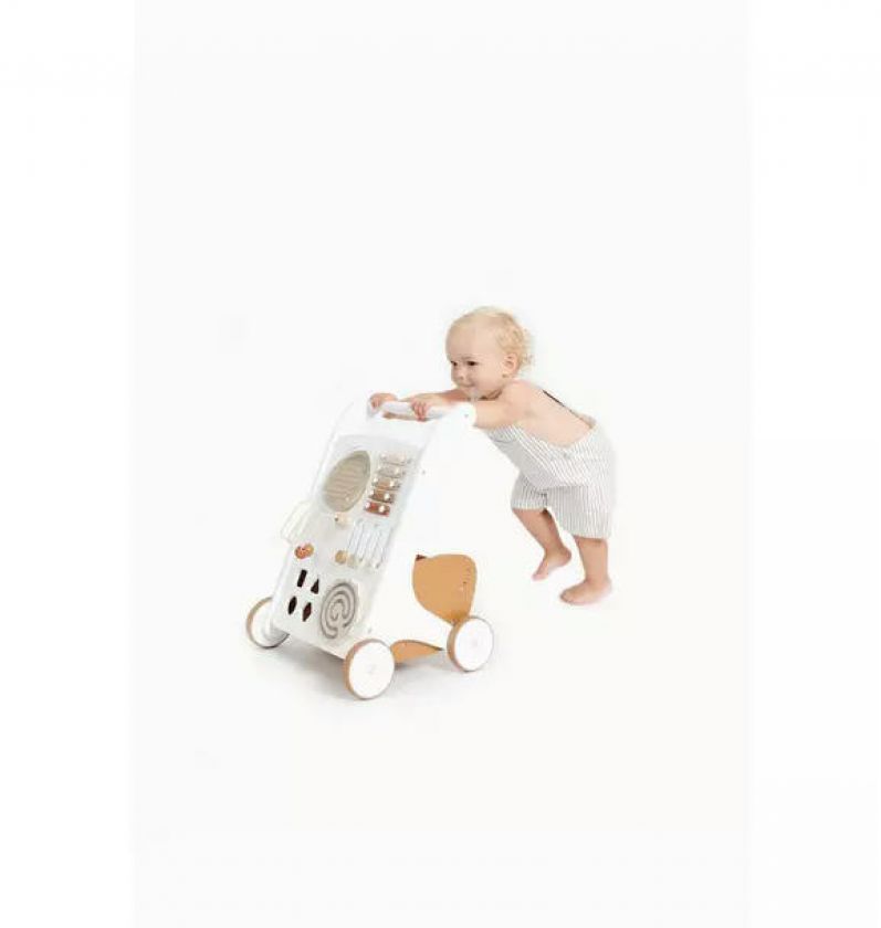 Comes with: spinning mirror and rain maker combo, wood block shapes sorter, adjustable friction wheels for different stage walkers, mallet included for xylophone, metal bead maze for dexterity, and basket for carrying toys.
