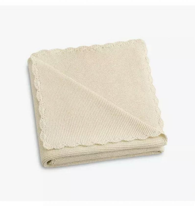 Knit Blanket: 100% cotton with a hand-stitched scalloped pattern. Size: 30” x 40”.
