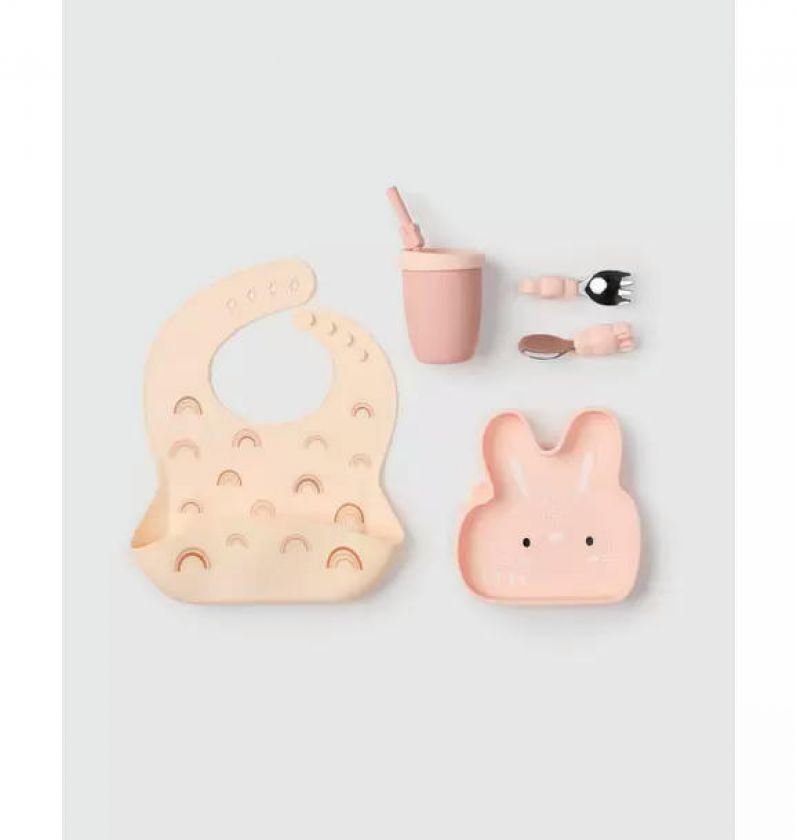 Hop into mealtime fun with our charming bunny-themed bundle! This set includes a bunny silicone kids cup with a straw, a bunny snack plate for delightful nibbles, and a learning set that empowers little ones to practice self-feeding—all crafted from 100% food-grade silicone and certified to the high LFGB standard. Paired with a soft, easy-to-clean Rainbow print silicone bib, this bundle offers a playful yet practical setup that keeps mealtime tidy and entertaining. Safe, durable, and perfectly sized for tiny hands, this set adds a touch of whimsy to everyday dining!