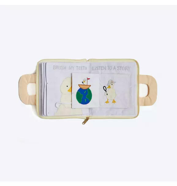 This beloved activity book is a timeless favorite, designed to enhance the joy and comfort of your little one's bedtime routine. As the adorable gooseling prepares for bed, it embarks on a series of engaging tasks: tidying up toys, shedding its feathers, enjoying a soothing bath, slipping into cozy pajamas, brushing its beak, and eagerly listening to a sleepy story. With durable handles for easy transport and a secure zipper closure, this book promises to be a trusted companion throughout all your adventures, offering gentle reminders of their essential sleep routine.