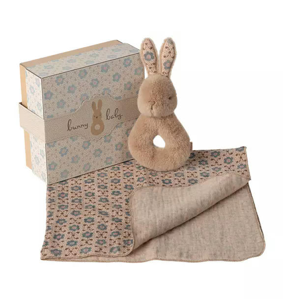 A perfect gift idea for the little ones. The set includes a soft cotton cloth and a small rabbit rattle. The rabbit has a small rattle inside that makes a soft sound. It all comes in a beautiful gift box.