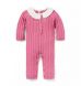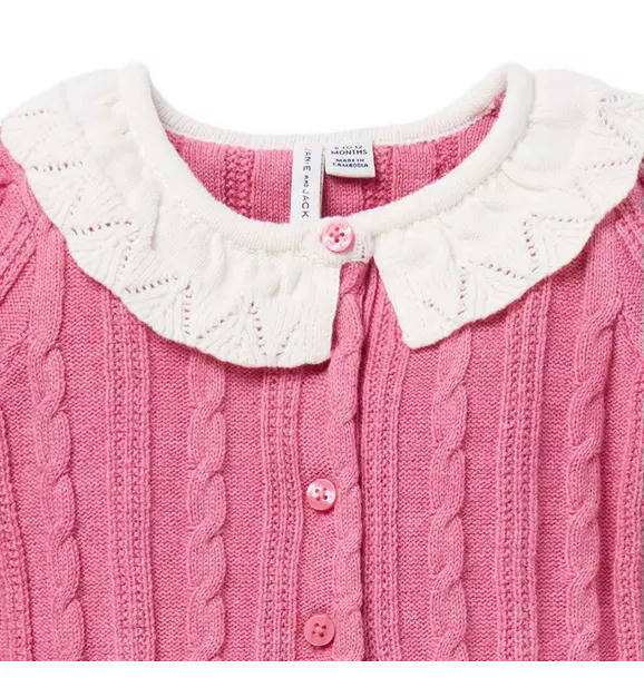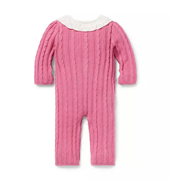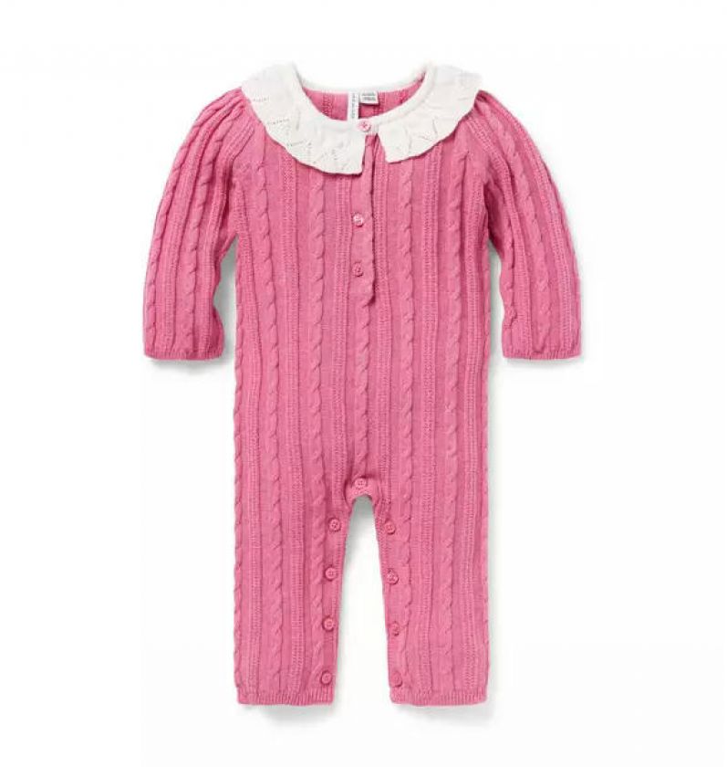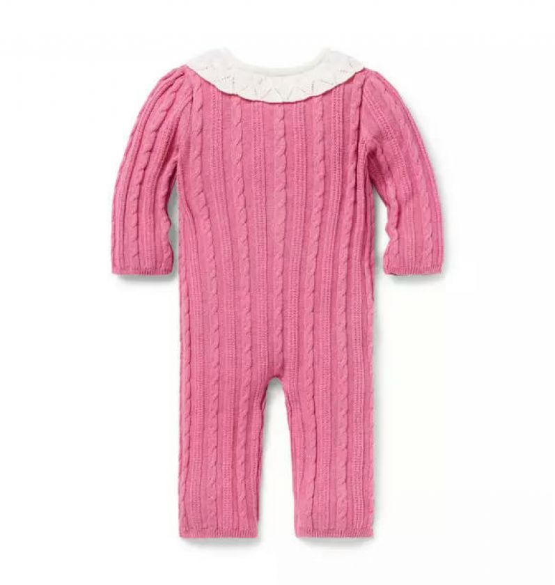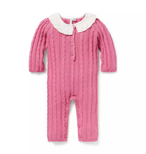 Oh-so-soft and ready for every first. Our sweater one-piece features cable knit details puff sleeves and a crochet-trimmed collar.